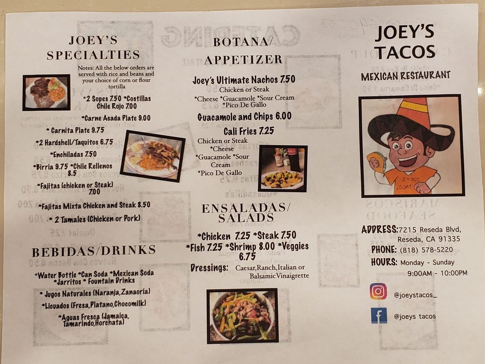 Welcome to Joey’s Tacos, a delightful mom-and-pop gem nestled at 7215 Reseda Blvd, Reseda, CA. Specializing in authentic Mexican cuisine, Joey's Tacos is perfect for both casual diners and families. With a diverse menu highlighted by the mouth-watering Asada and chicken tacos, each dish reflects the rich flavors and traditions of Mexican culinary art.